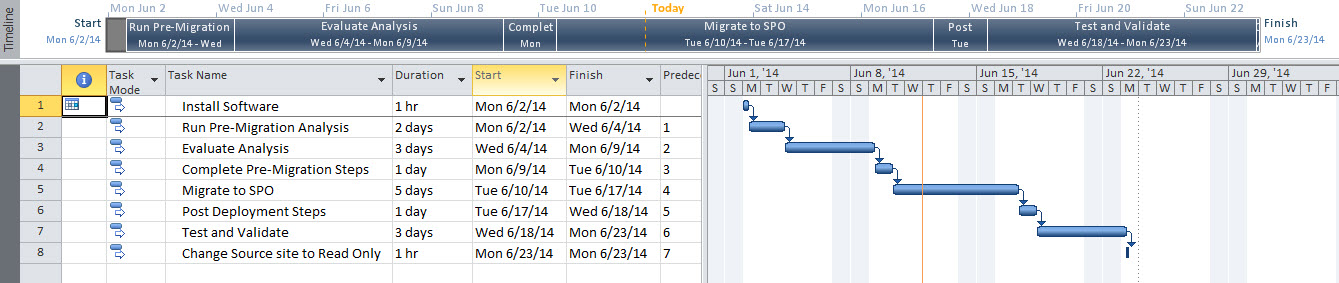 Once a site has been scheduled for migration create a new Migration Schedule this will be a quick reference that will have all the tasks associated with the migration. This schedule can be in the form or a Project Timeline, a Calendar or even in One Note.