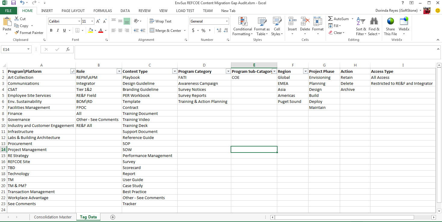The Content Mapping Spreadsheet will also allow you to map your tagging and disposition of content based on your review. It is easy to modify to your organization so that the drop-down menus are relevant. In the example below you can see that quite a bit of the tagging is captured so that when you move this content you know what the new tags will be.